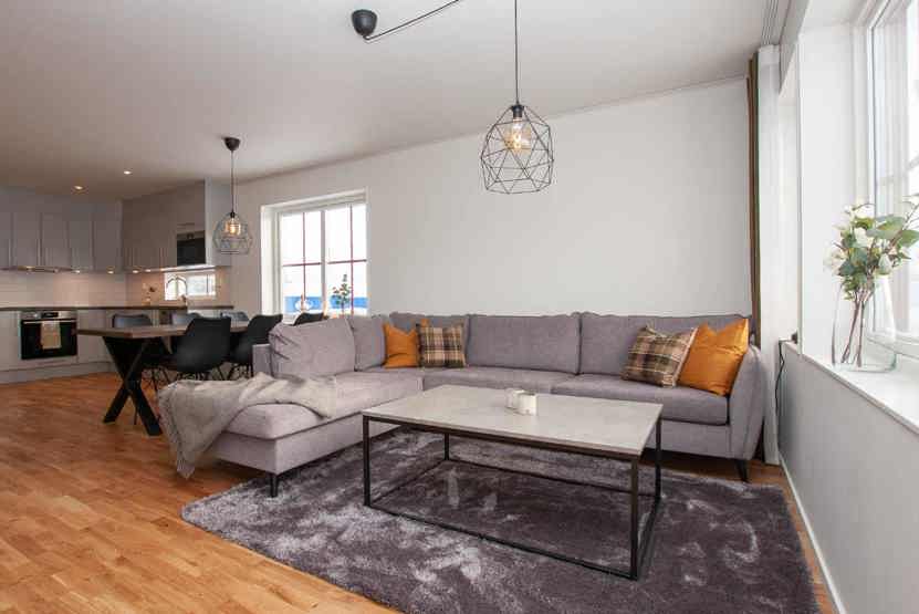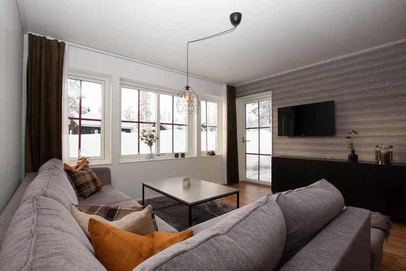 Stue med lille køkkenafdeling, TV, brændeovn (brænde indgår ikke).