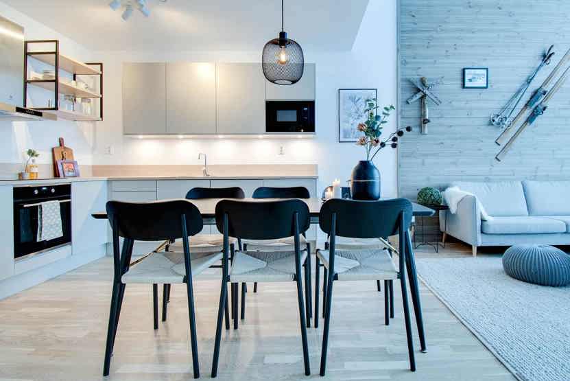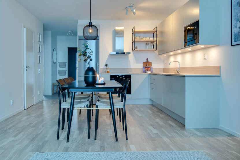 Køkkenet indeholder induktionskomfur, ovn, køleskab med fryser, opvaskemaskine, mikro.