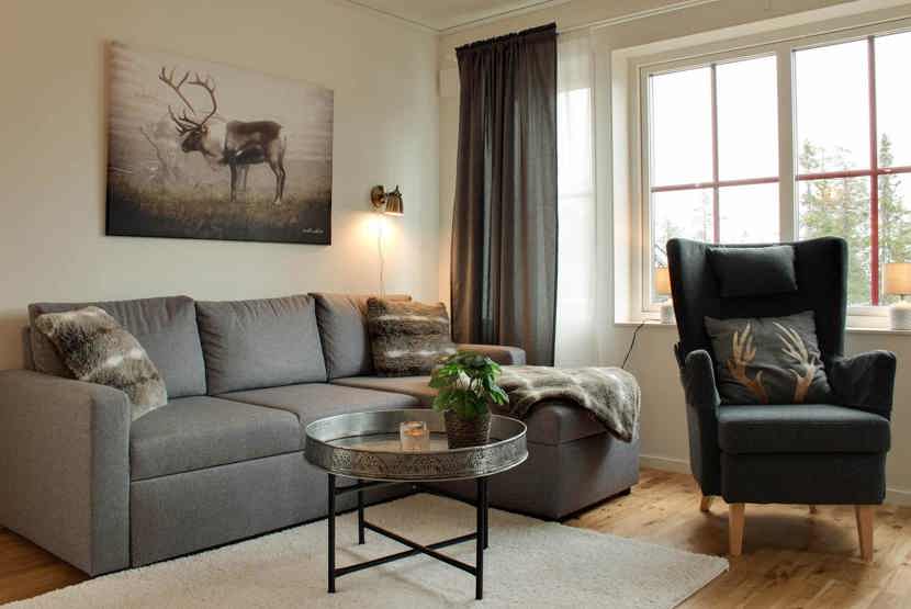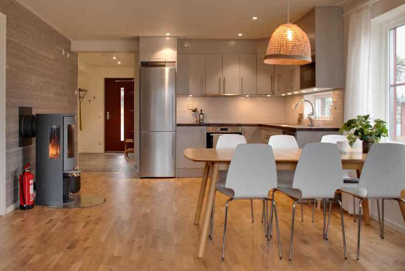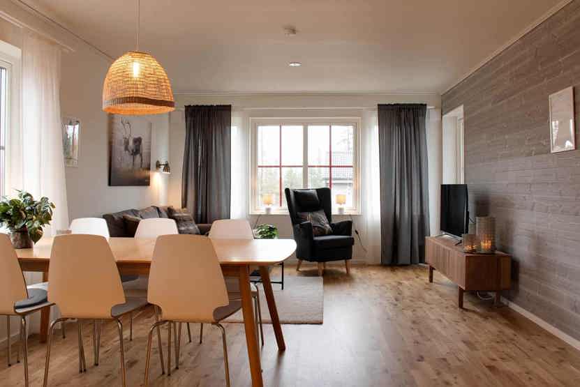 Stue med lille køkkenafdeling, TV, brændeovn (brænde indgår ikke).