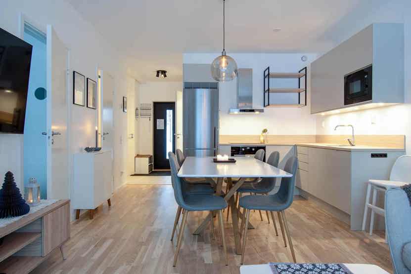 Køkkenet indeholder komfur med ovn, køleskab med fryser, opvaskemaskine, mikro.