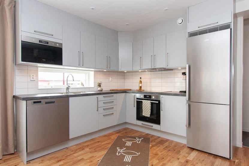 Køkkenet indeholder komfur med ovn, køleskab med fryser, opvaskemaskine, mikro.