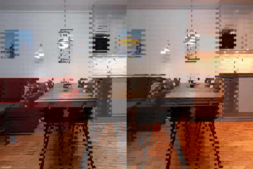 Stue med lille køkkenafdeling, TV, brændeovn (brænde indgår ikke).