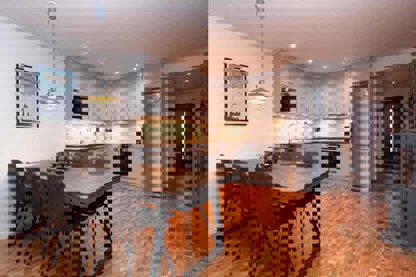 Køkkenet indeholder komfur med ovn, køleskab med fryser, opvaskemaskine, mikro.