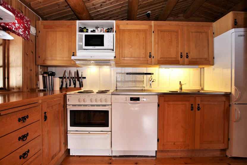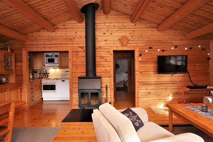 Stue med TV, lille køkkenafdeling, brændeovn (brænde indgår ikke).