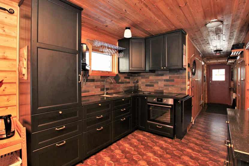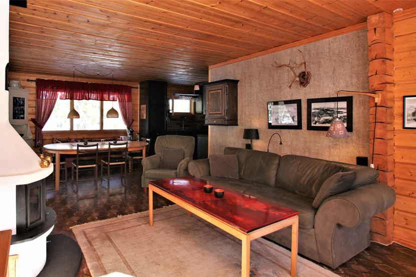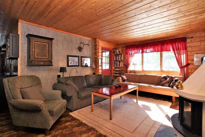 Stue med TV, lille køkkenafdeling, brændeovn (brænde indgår ikke).