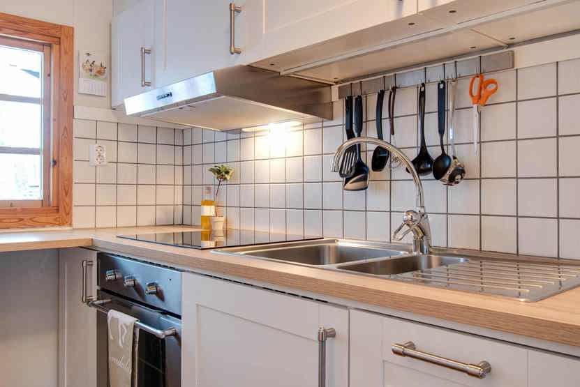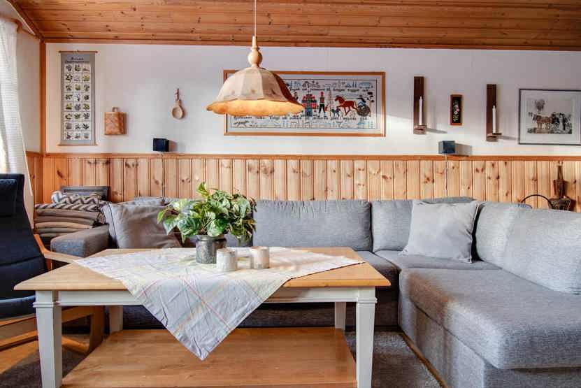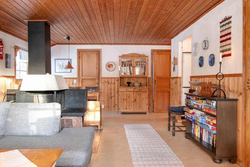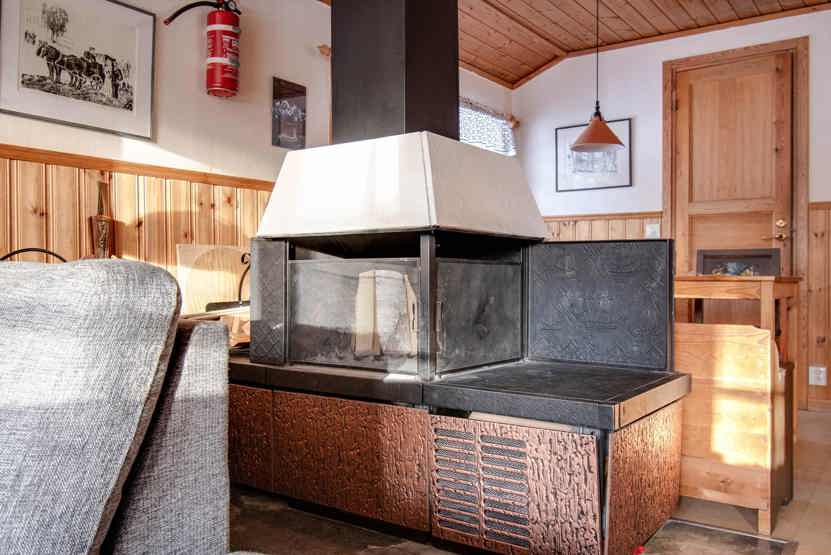 Stue med TV, lille køkkenafdeling, brændeovn (brænde indgår ikke).