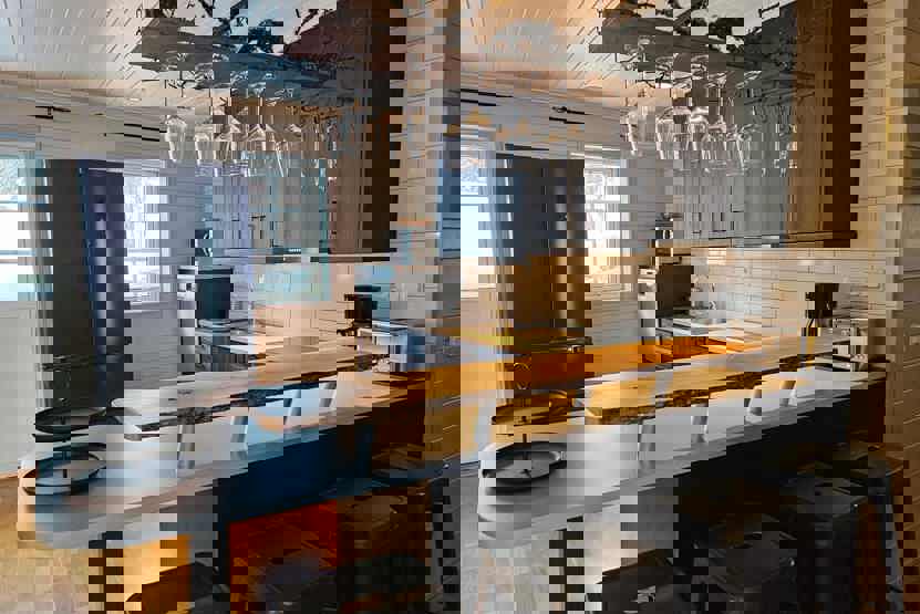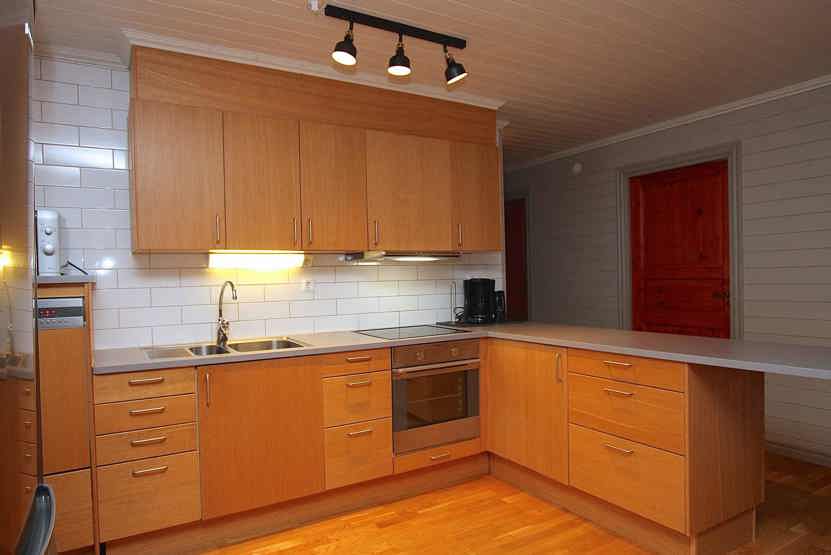 Køkkenet indeholder komfur med ovn, køleskab med fryser, opvaskemaskine, mikro.
