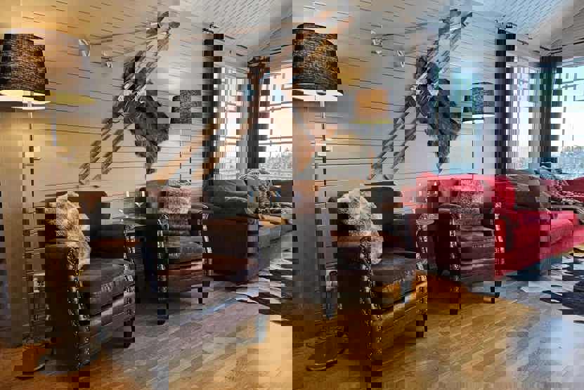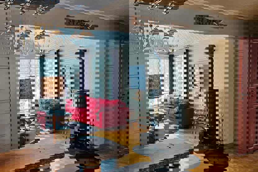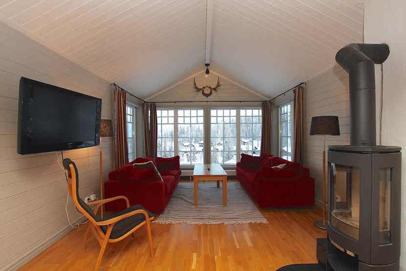 Stue med lille køkkenafdeling, 2 TV, brændeovn (brænde indgår ikke).