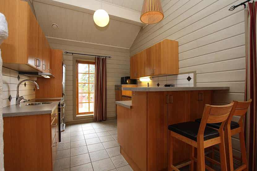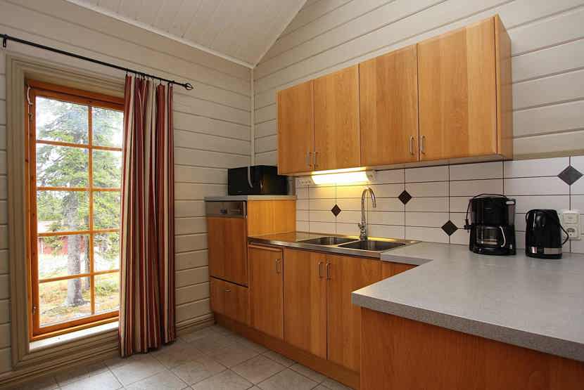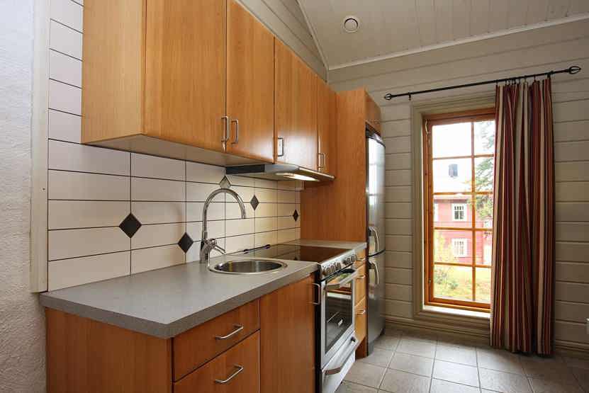 Køkkenet indeholder komfur med ovn, køleskab med fryser, opvaskemaskine, mikro.
