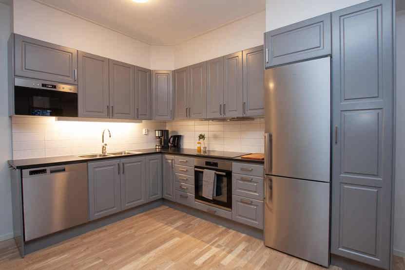 Køkkenet indeholder ovn, mikro, køleskab med fryser, komfur, opvaskemaskine.
