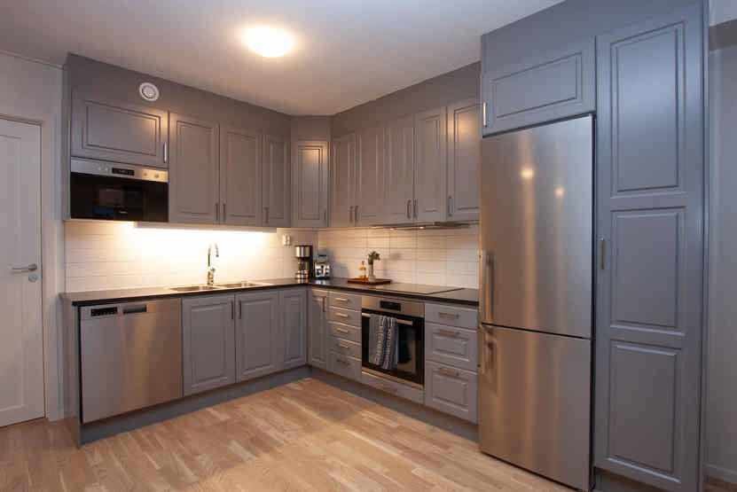 Køkkenet indeholder ovn, mikro, køleskab med fryser, komfur, opvaskemaskine.