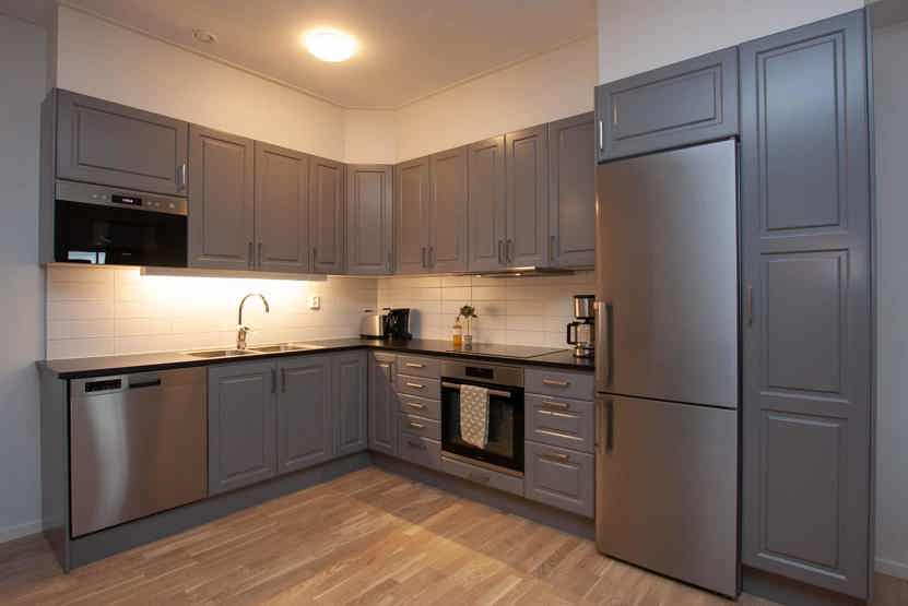 Køkkenet indeholder ovn, mikro, køleskab med fryser, komfur, opvaskemaskine.