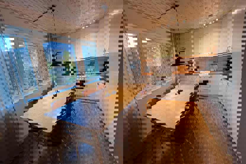 Køkkenet indeholder komfur med ovn, køleskab med fryser, opvaskemaskine, mikro.