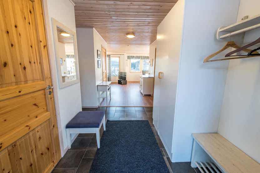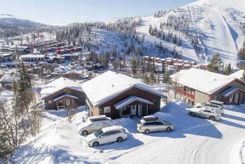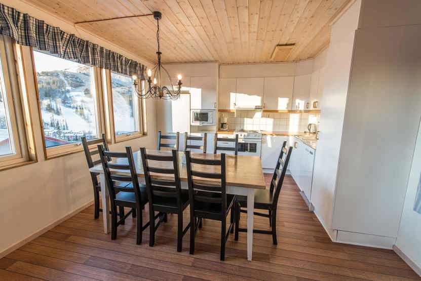 Terrasshusen ligger i Vemdalsskalet. Lejlighed på første etage, 6 sengepladser, 72 kvm, alrum med køkkenafdeling, 3 soveværelse, 1 bruser, 2 WC, sauna.