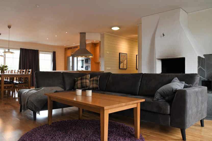 Stue med lille køkkenafdeling, TV, åben pejs (brænde indgår ikke).