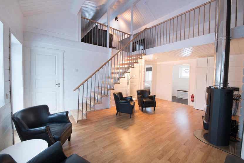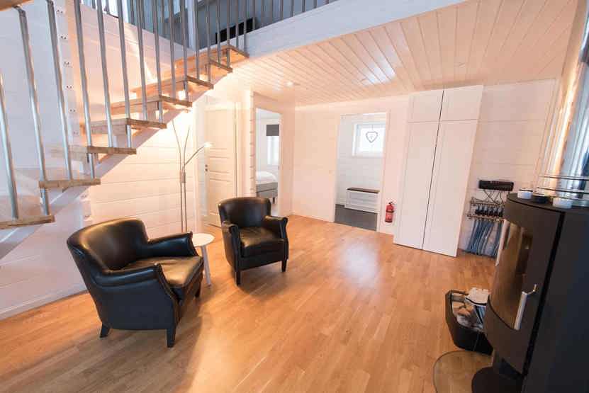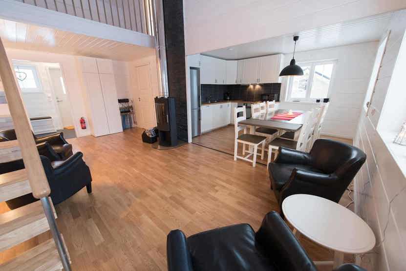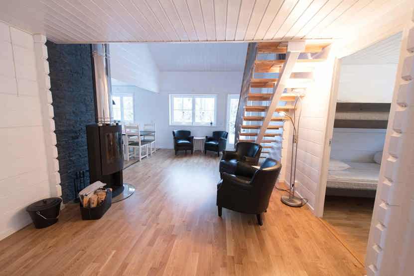Stue med lille køkkenafdeling, TV, brændeovn (brænde indgår ikke).