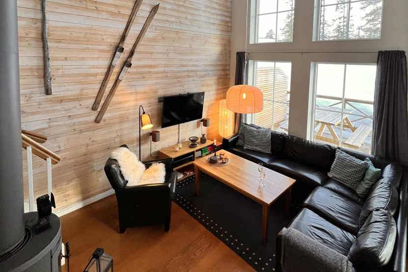 Stue med lille køkkenafdeling, TV, brændeovn (brænde indgår ikke).