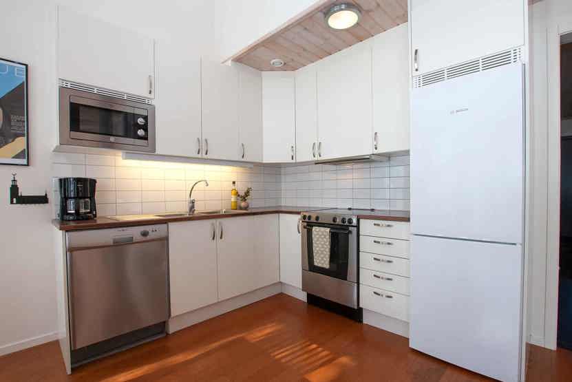 Køkkenet indeholder komfur med ovn, køleskab med fryser, opvaskemaskine, mikro.