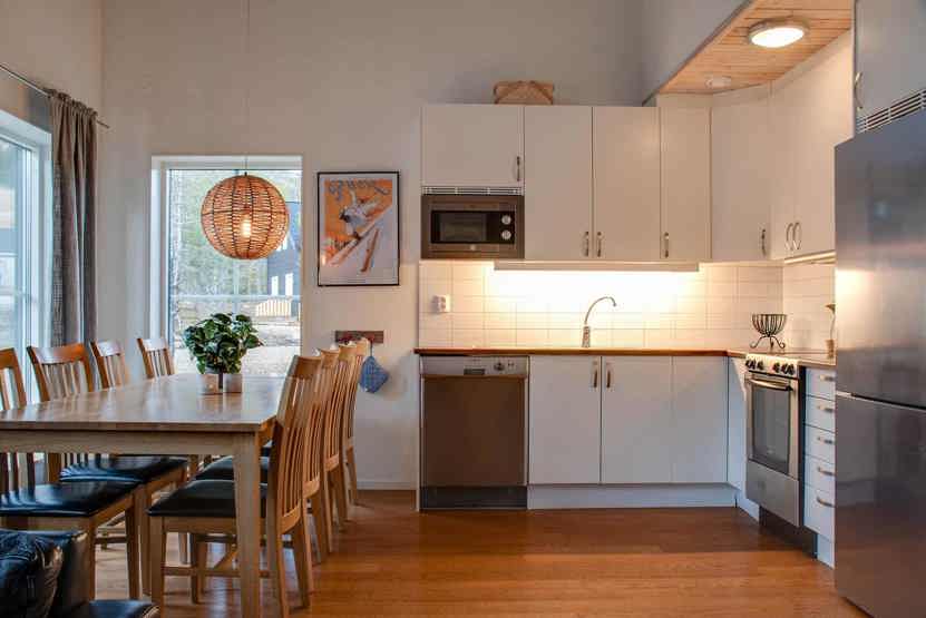 Køkkenet indeholder komfur med ovn, mikro, køleskab med fryser, opvaskemaskine.