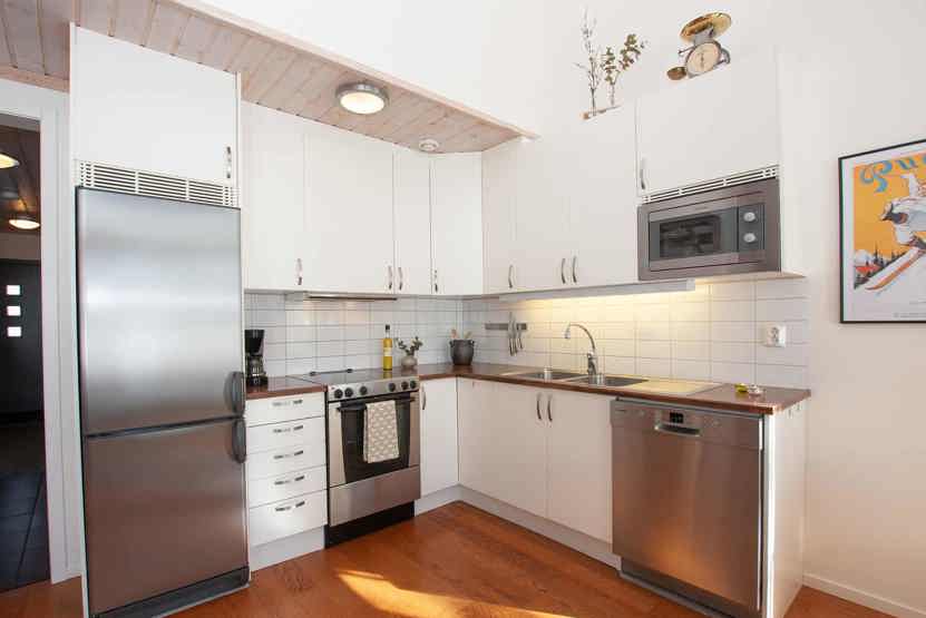 Køkkenet indeholder komfur med ovn, mikro, køleskab med fryser, opvaskemaskine.