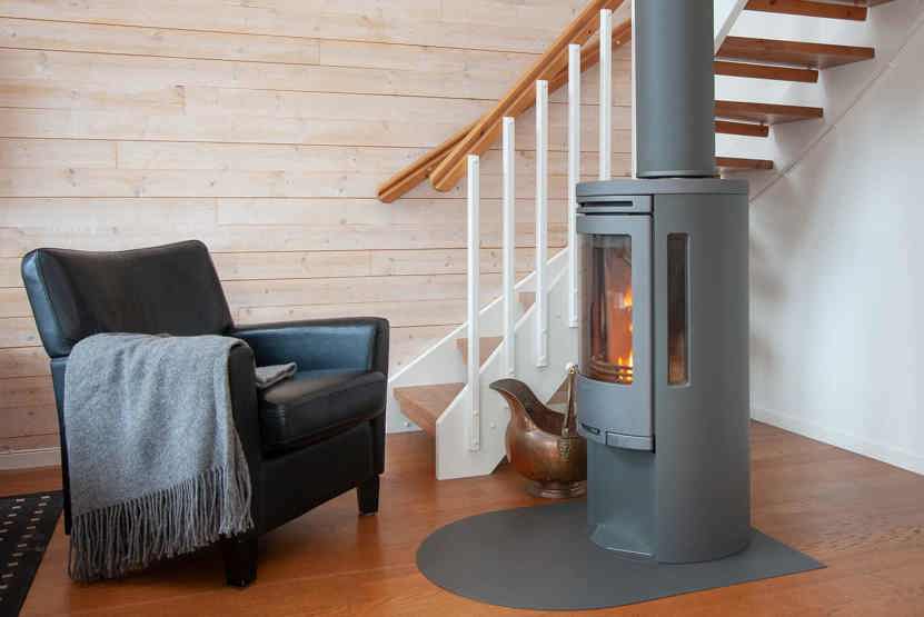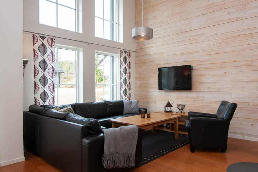 Stue med TV, lille køkkenafdeling, brændeovn (brænde indgår ikke).