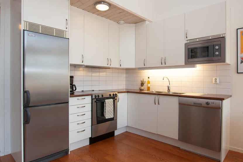 Køkkenet indeholder komfur med ovn, mikro, køleskab med fryser, opvaskemaskine.