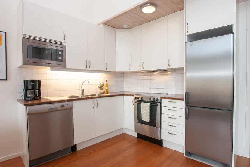 Køkkenet indeholder komfur med ovn, mikro, køleskab med fryser, opvaskemaskine.