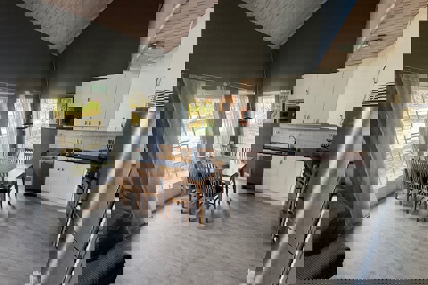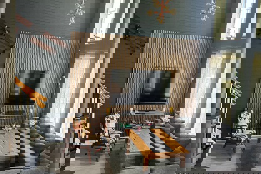 Stue med TV, lille køkkenafdeling, brændeovn (brænde indgår ikke).