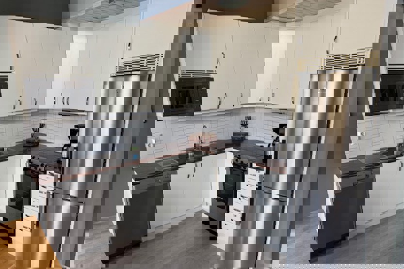 Køkkenet indeholder komfur med ovn, mikro, køleskab med fryser, opvaskemaskine.