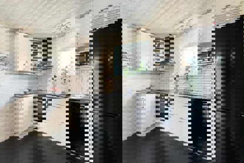 Køkkenet indeholder elkomfur med ovn, køleskab med fryser, opvaskemaskine, mikro.
