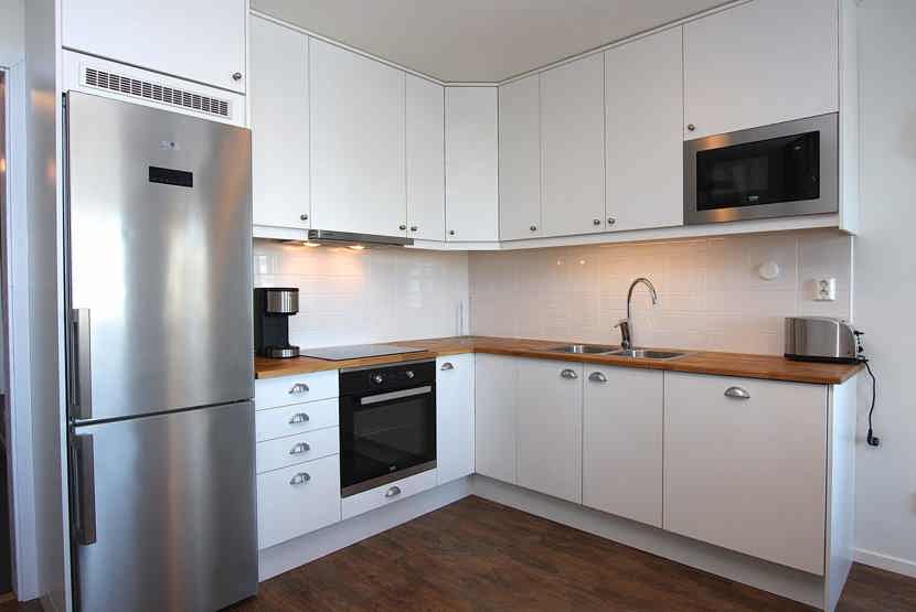 Køkkenet indeholder komfur med ovn, køleskab med fryser, opvaskemaskine, mikro.