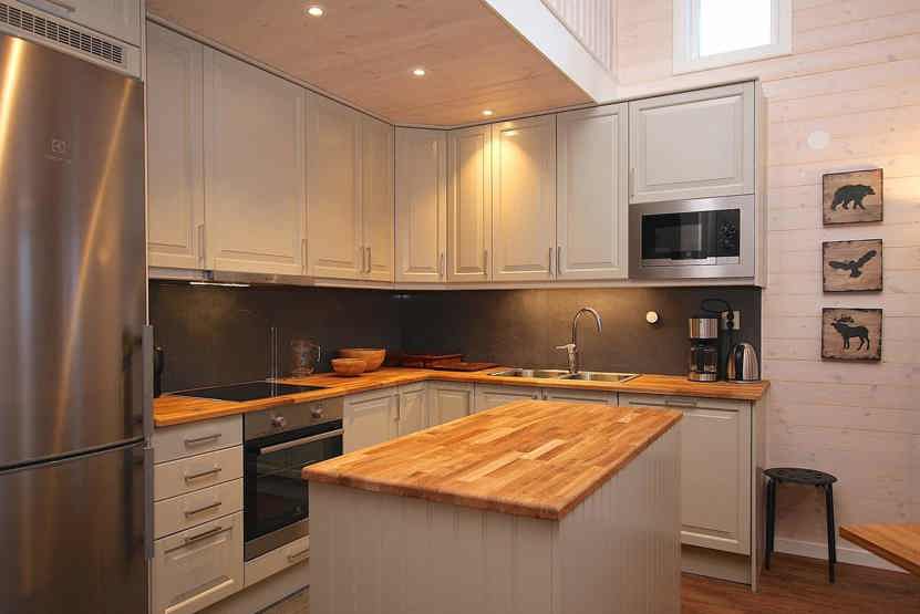 Køkkenet indeholder komfur, ovn, køleskab med fryser, opvaskemaskine, mikro.