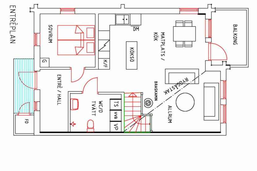 Stue med lille køkkenafdeling, TV, brændeovn (brænde indgår ikke).