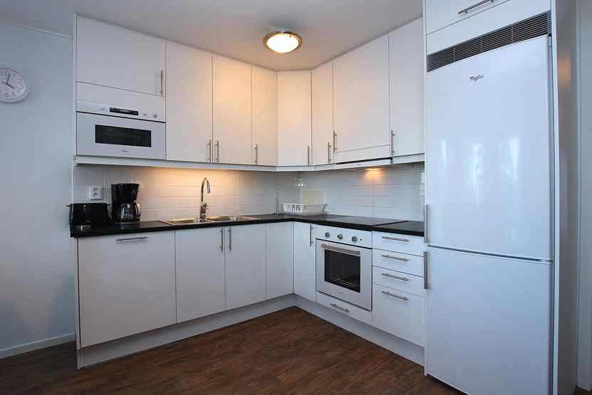 Køkkenet indeholder komfur med ovn, køleskab med fryser, opvaskemaskine, mikro.