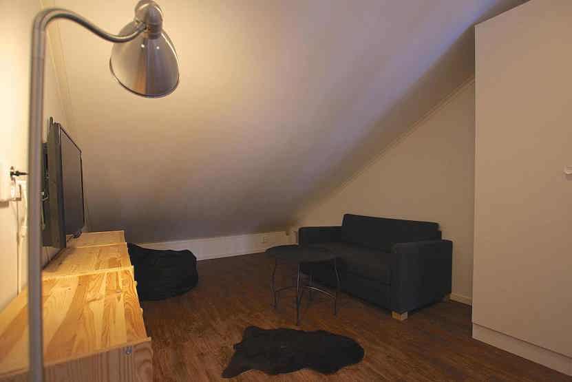 Stue med lille køkkenafdeling, TV, brændeovn (brænde indgår ikke).