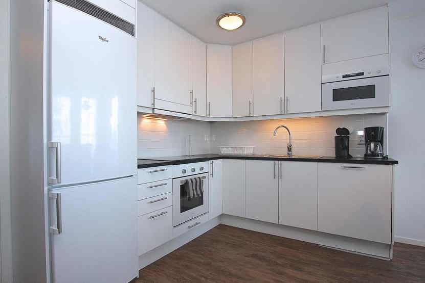 Køkkenet indeholder komfur med ovn, køleskab med fryser, opvaskemaskine, mikro.