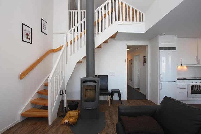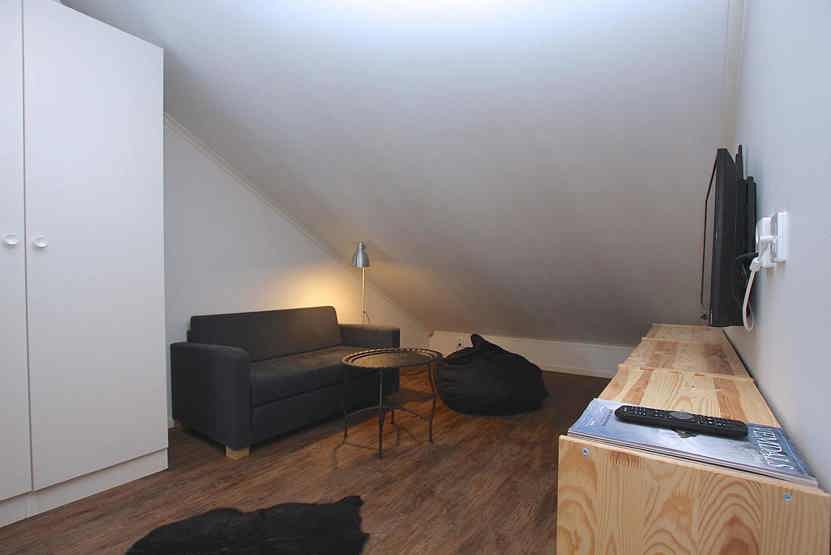 Stue med lille køkkenafdeling, TV, brændeovn (brænde indgår ikke).