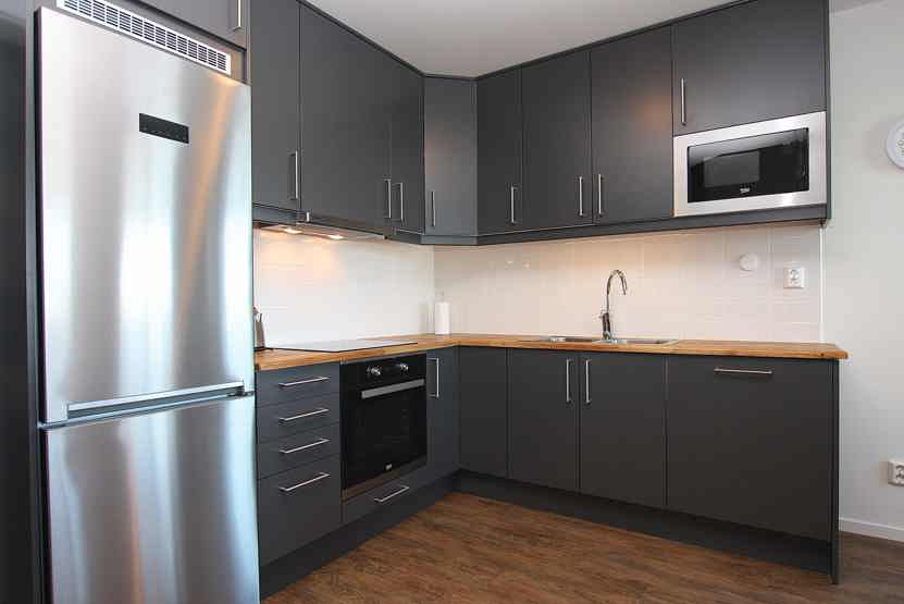 Køkkenet indeholder komfur med ovn, køleskab med fryser, opvaskemaskine, mikro.