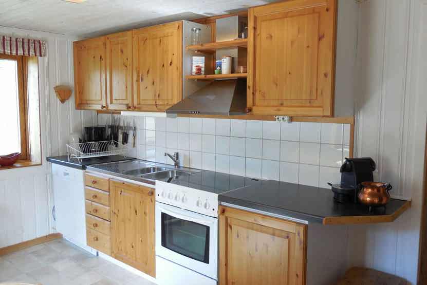 Køkkenet indeholder komfur med ovn, køleskab med fryser, opvaskemaskine, mikro.