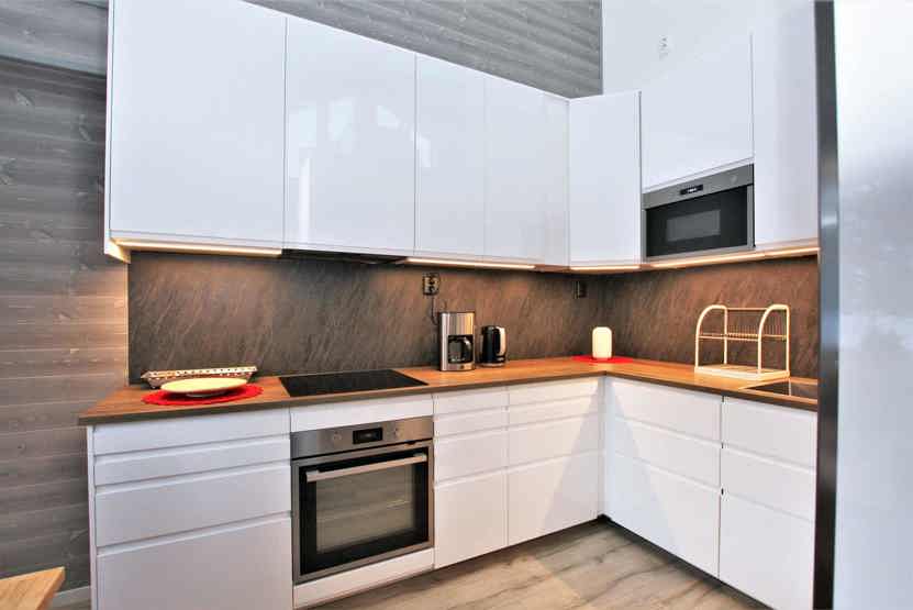 Køkkenet indeholder komfur, ovn, køleskab med fryser, opvaskemaskine, mikro.