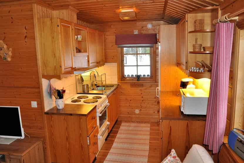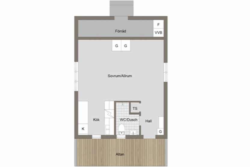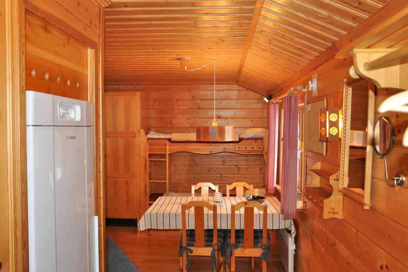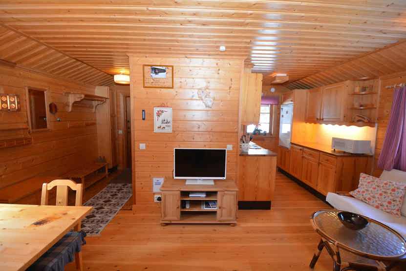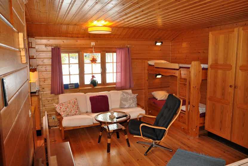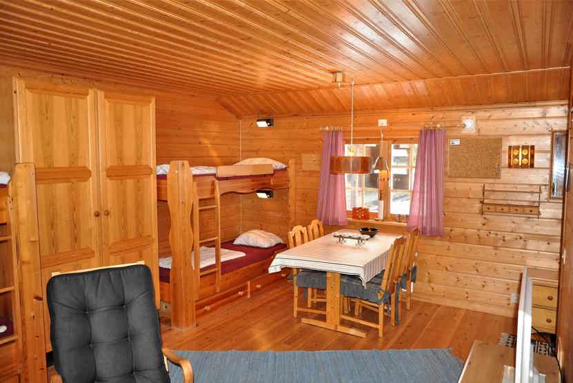 Stue med kombinerad sov och köksavdelning, TV, 2 køjesenge.