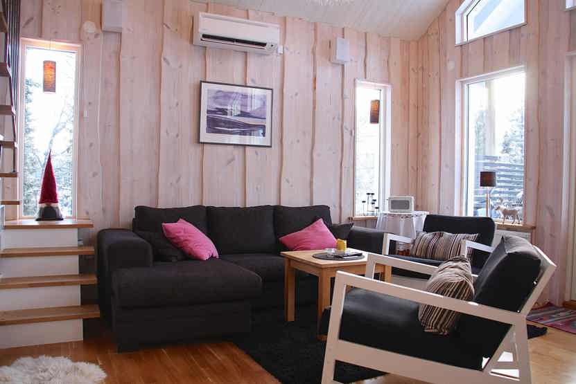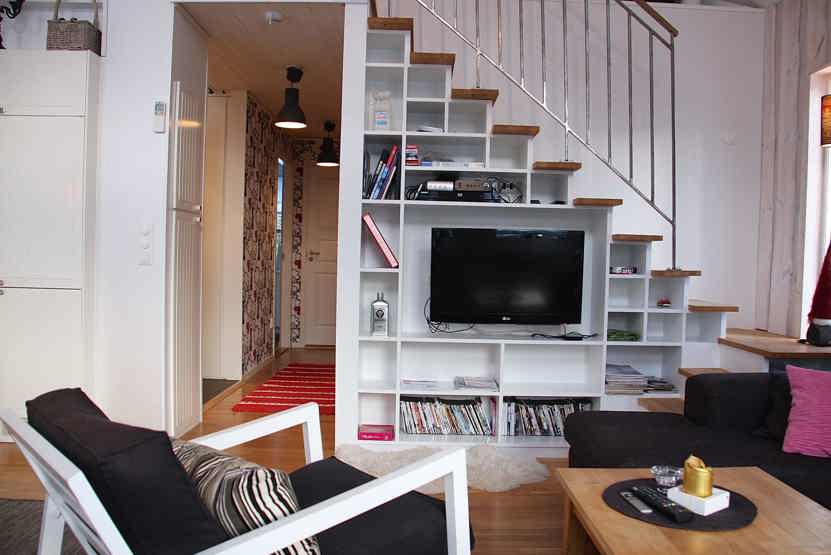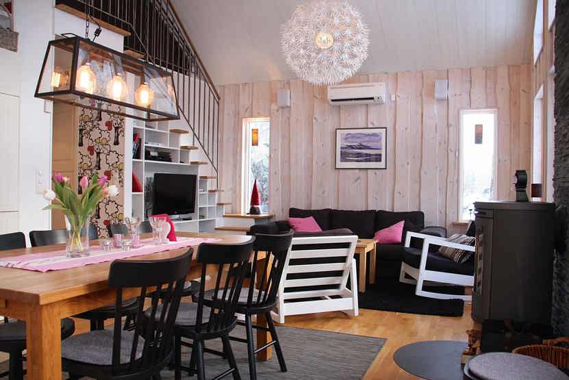 Stue med lille køkkenafdeling, TV, brændeovn (brænde indgår ikke).