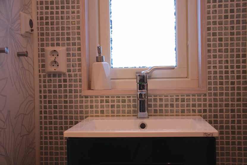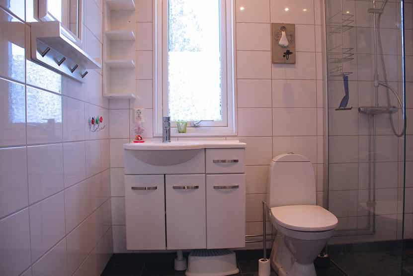 Badeværelse 1 = bruser/WC, (lille sauna, passende for 4 personer). Badeværelse 2 = wc.