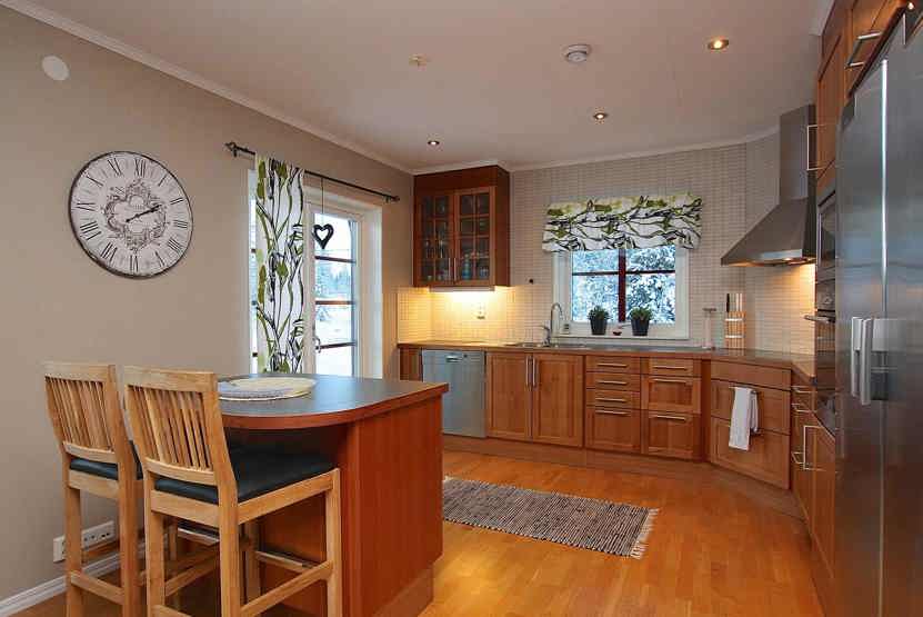 Køkkenet indeholder komfur med ovn, køleskab med fryser, opvaskemaskine, mikro.