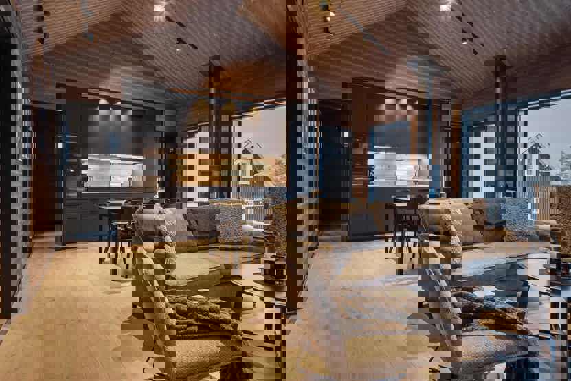 Stue med lille køkkenafdeling, TV, brændeovn (brænde indgår ikke).