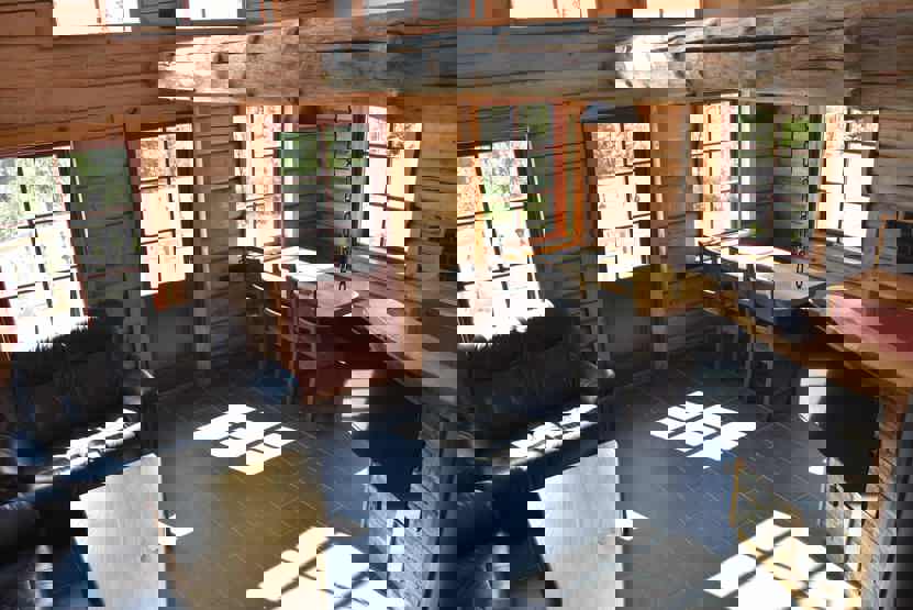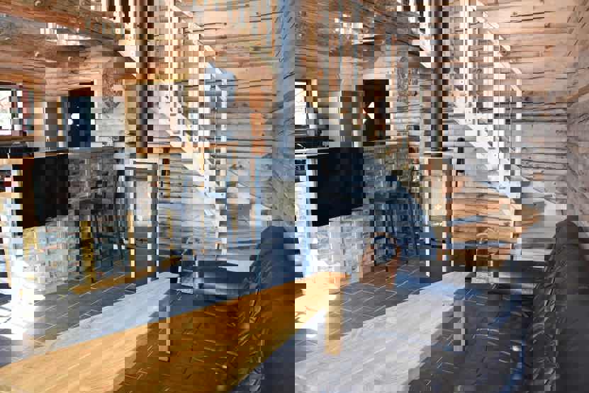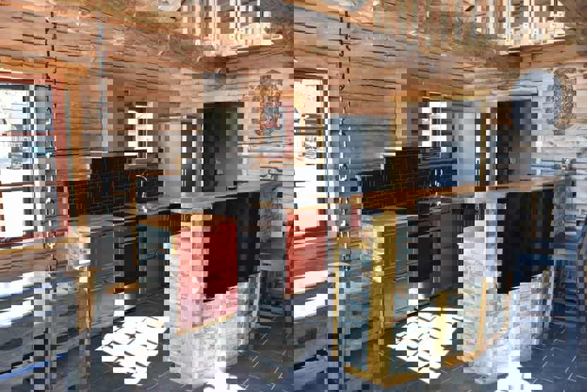 Stue med lille køkkenafdeling, TV, brændeovn (brænde indgår ikke).