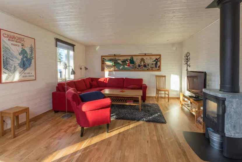 Stue med lille køkkenafdeling, TV, brændeovn (brænde indgår ikke).