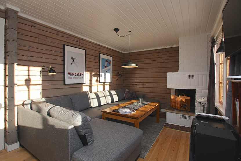 Stue med lille køkkenafdeling, TV, åben pejs (brænde indgår ikke).