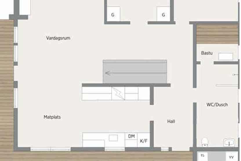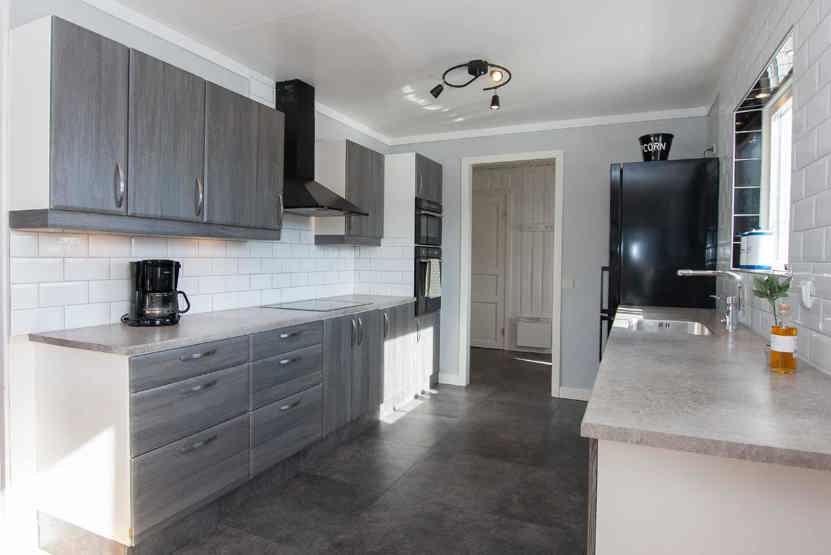Stue med lille køkkenafdeling, TV, brændeovn (brænde indgår ikke).