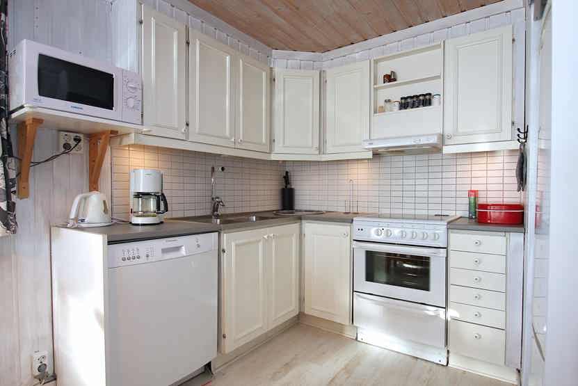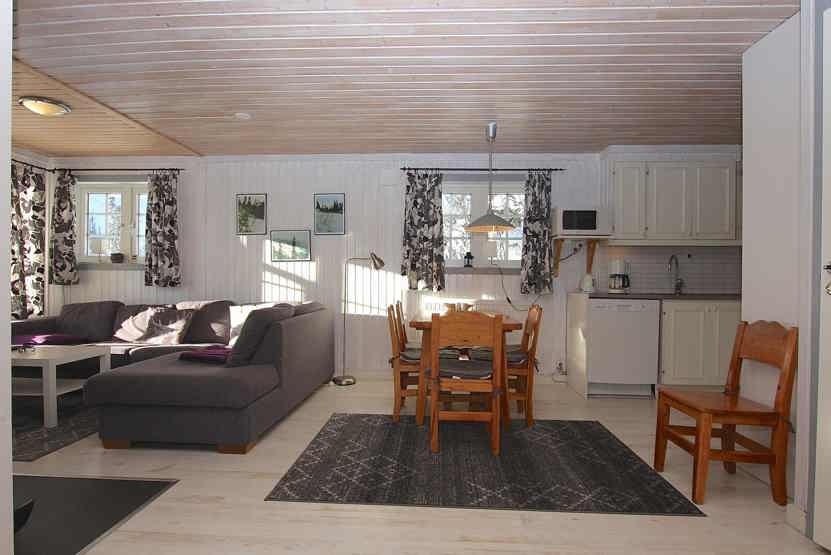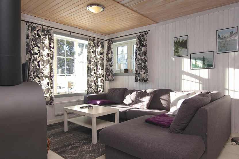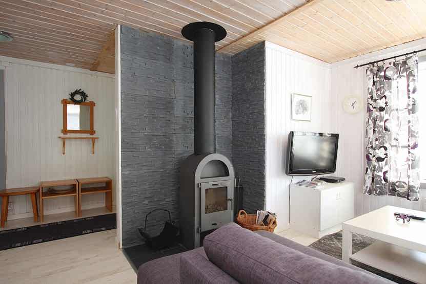 Stue med TV, lille køkkenafdeling, brændeovn (brænde indgår ikke).